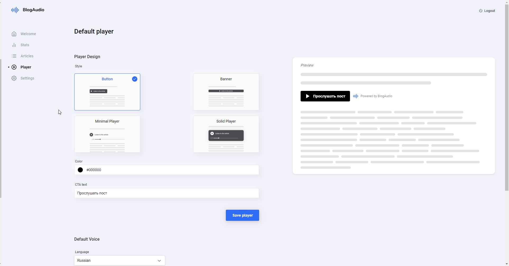 Внешний вид плеера, язык и голос движка можно настроить под дизайн сайта в разделе Player.