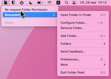 В том случае, если вы хотите получить быстрый доступ к документам, файлам, папкам или приложениям прямо из панели macOS вам понадобиться утилита Folder Peek.