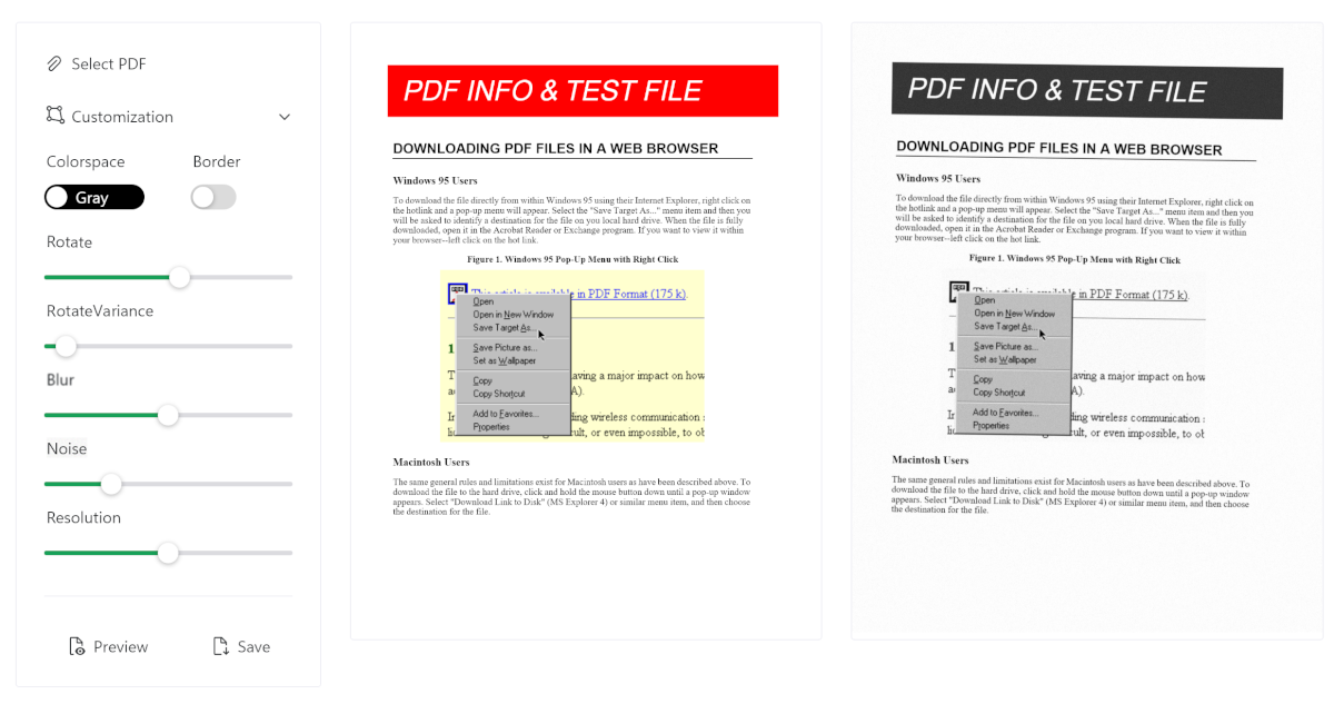 Здесь вы можете загрузить любой PDF-документ и применить к нему различные эффекты, которые помогут придать ему вид отсканированности.