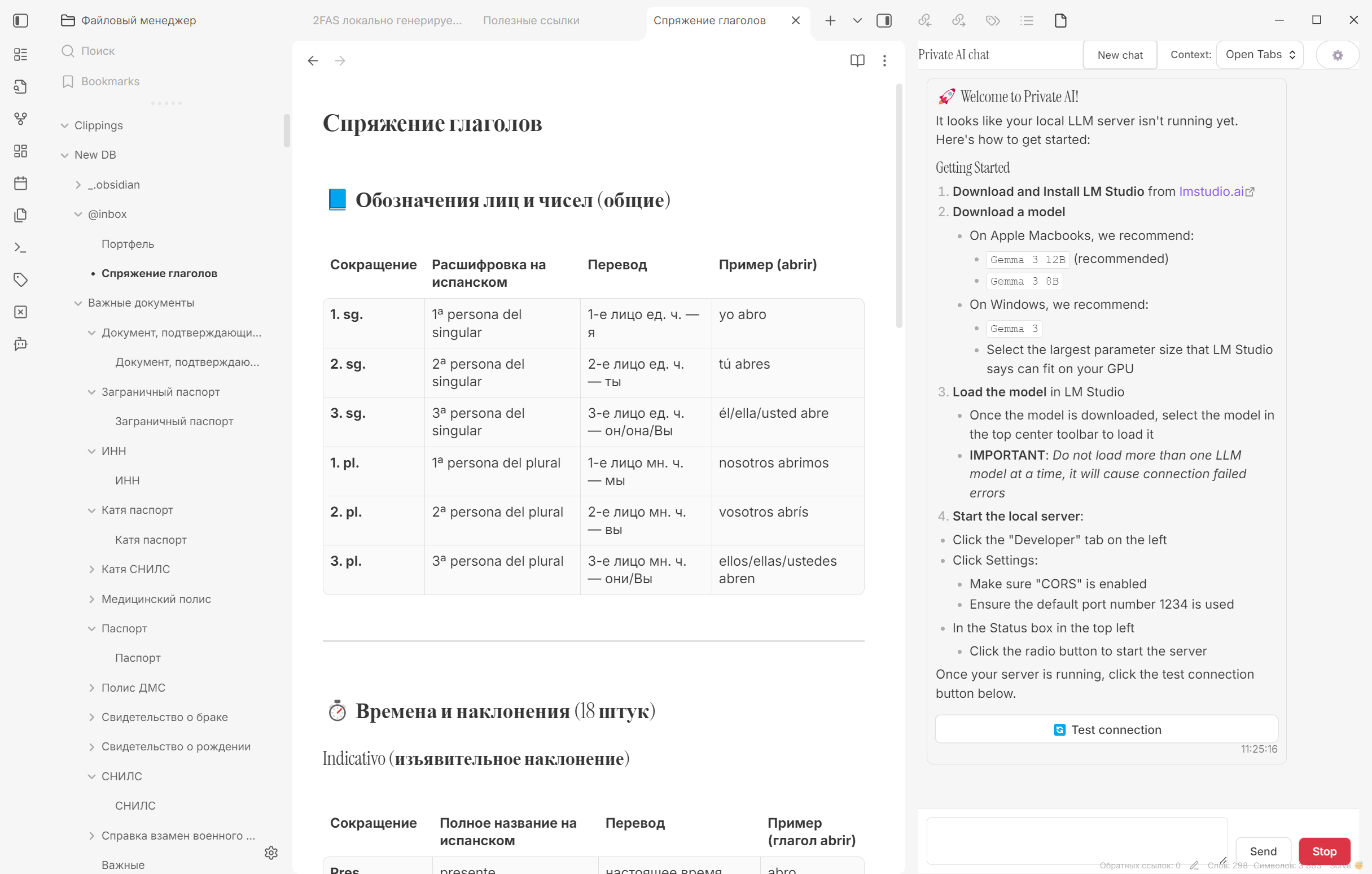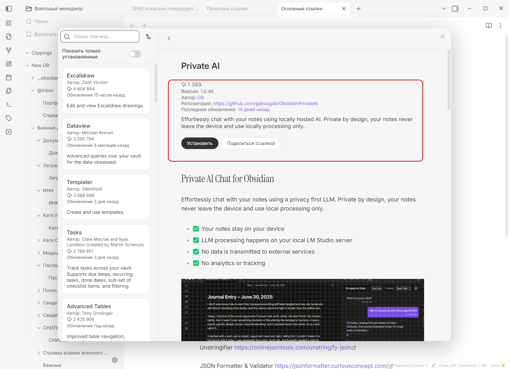 Например, добавить чат с ИИ можно в заметочник Obsidian с помощью плагина Private AI. Он поможет обрабатывать заметки с помощью локальной нейросети на базе LM Studio.