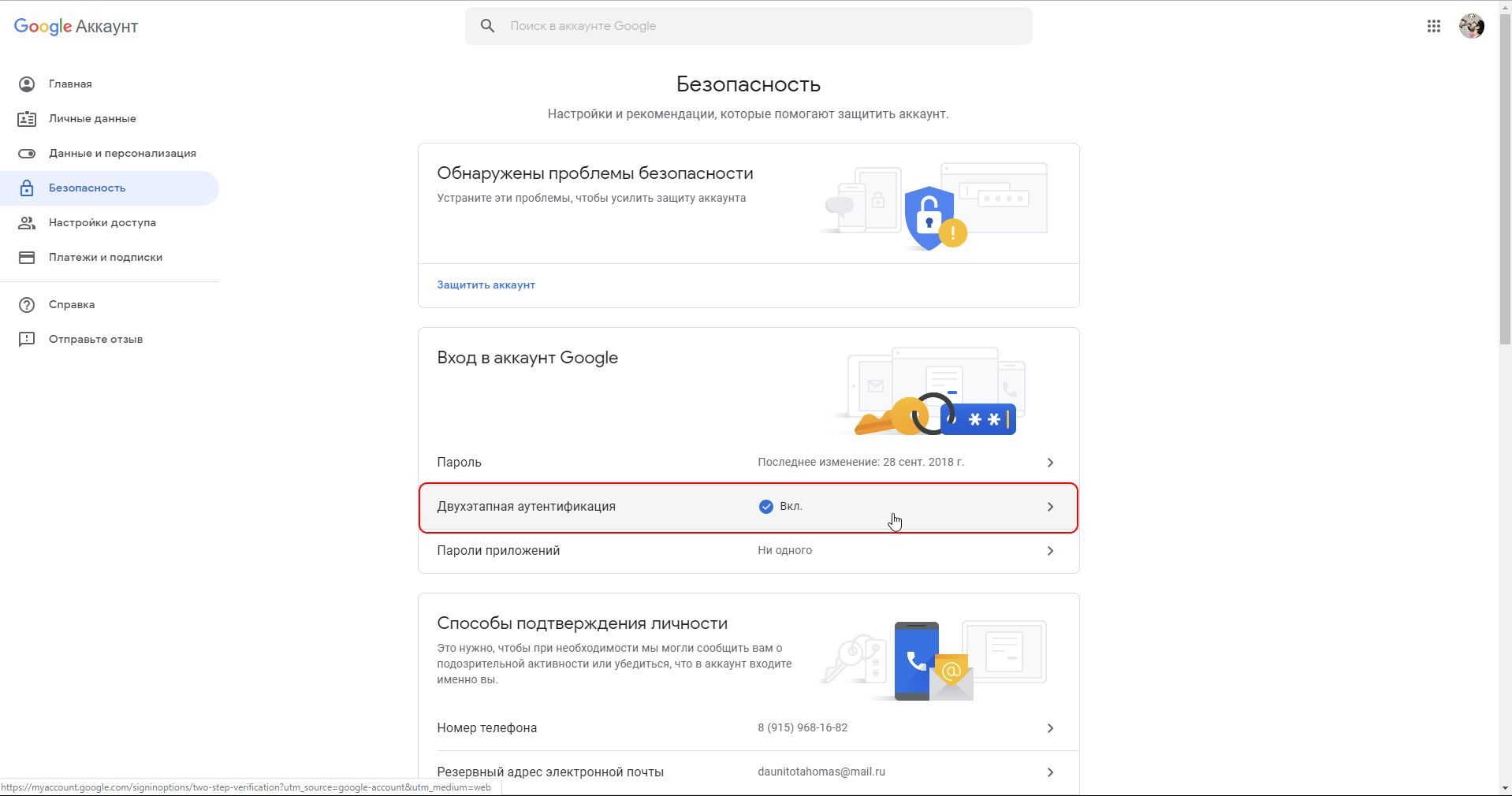 Если всё сходится, то можно продолжать. Перейдите в настройки безопасности вашего аккаунта Google по этой ссылке. Нажмите на раздел «Двухэтапная аутентификация»