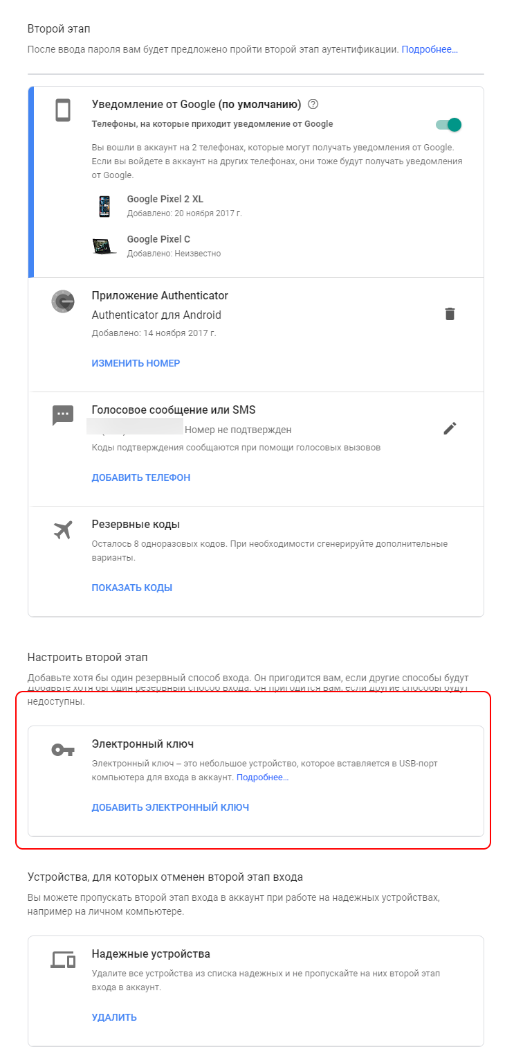 Промотайте страницу в самый низ и в разделе «Настроить второй этап» добавьте электронный ключ.