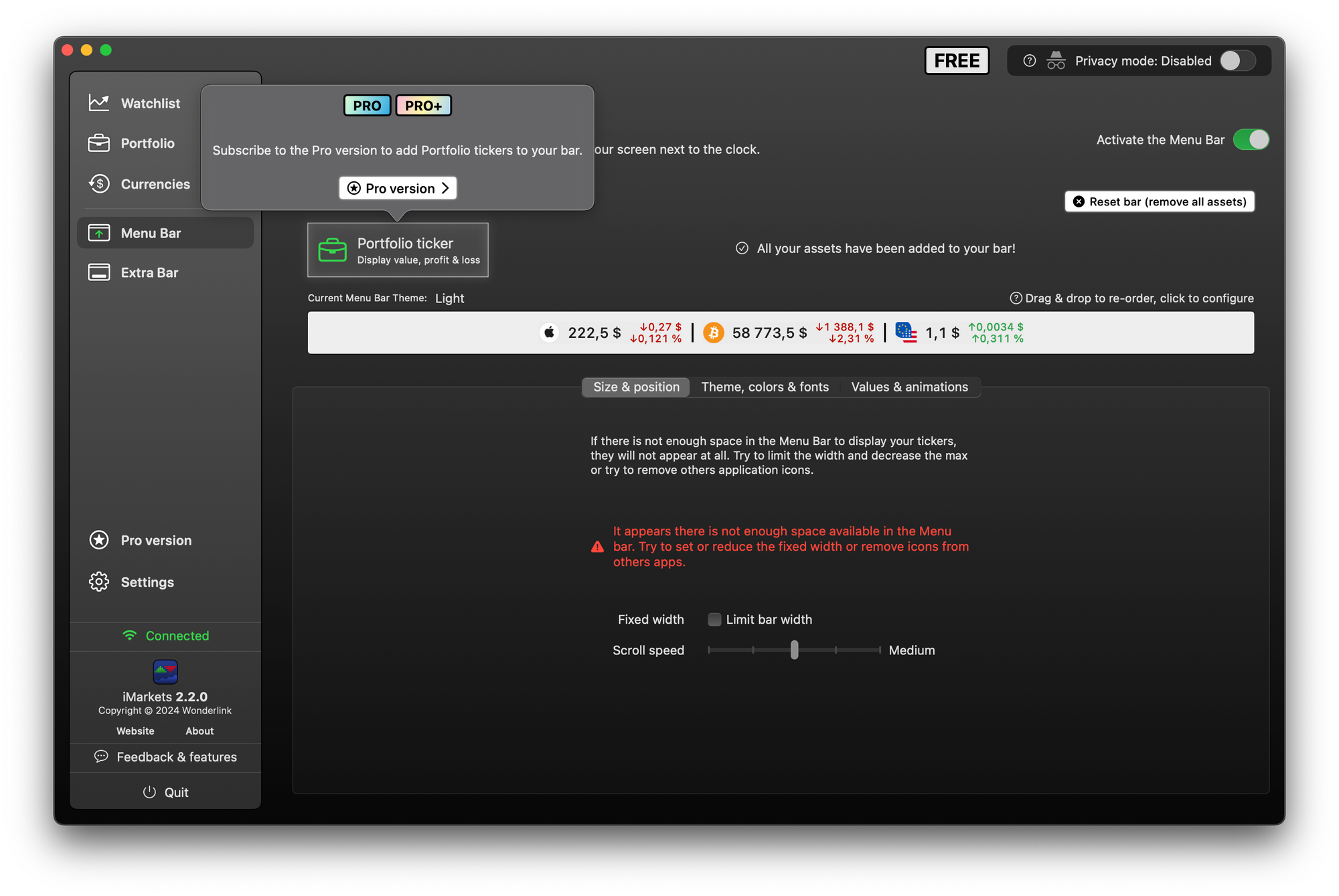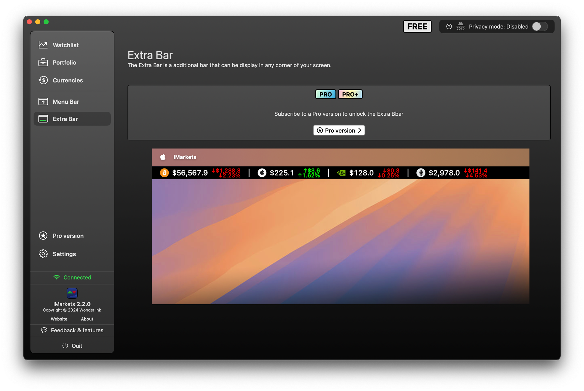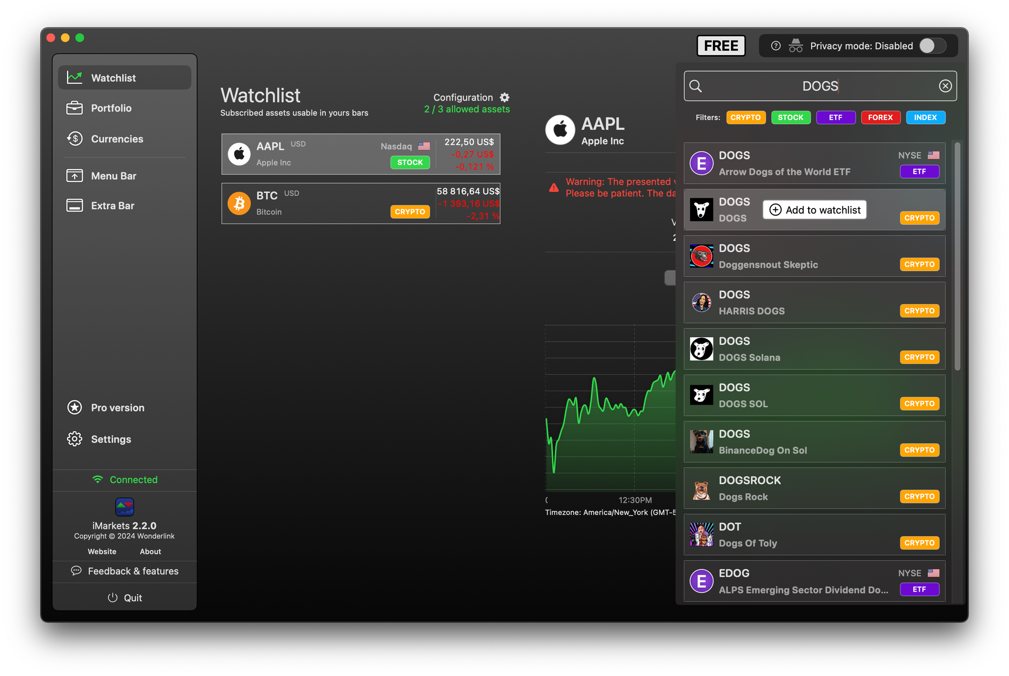Хотя на сайте и указано, что iMarkets — бесплатное приложение, по факту это не так. В бесплатной версии можно отслеживать три любых тикера, а все фишки по работе со Строкой меню будут недоступны.