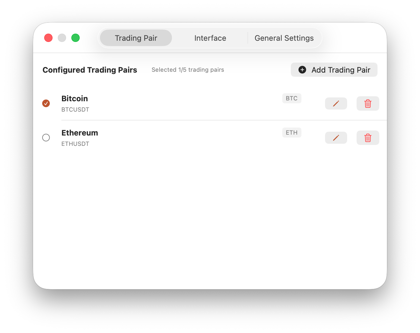 По умолчанию отображается цена BTC, но в настройках можно добавить любую другую необходимую торговую пару.