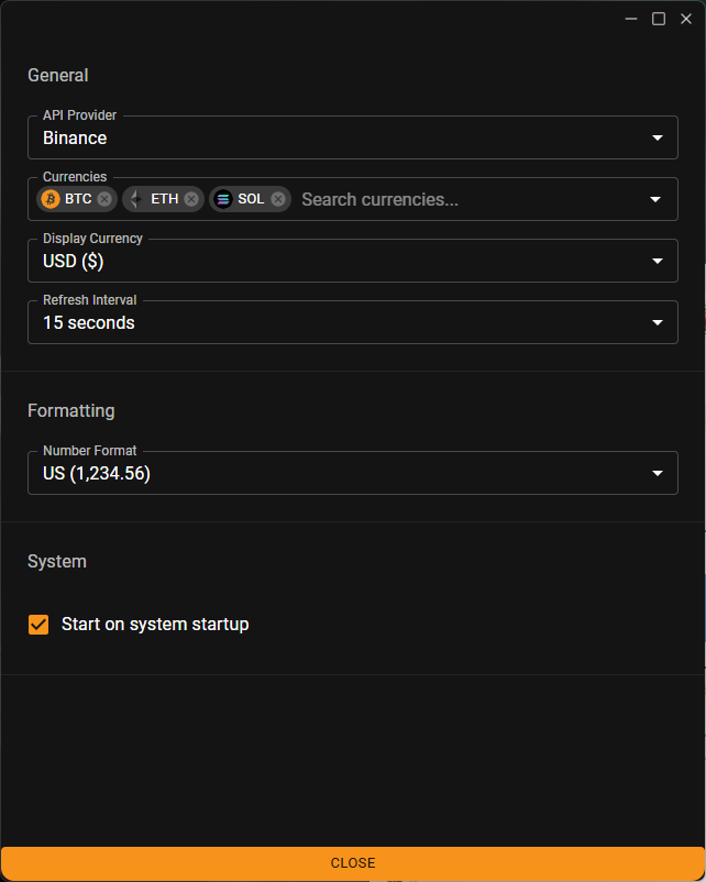 В настройках можно поменять источник получения цен (по умолчанию Binance, изменить отслеживаемую крипту, фиатную валюту и период обновления цен.
