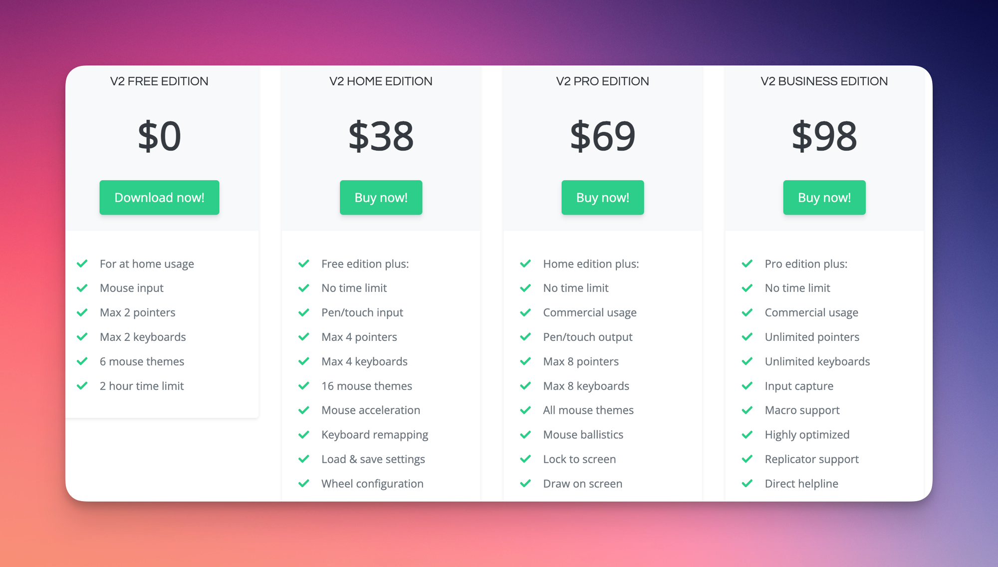 В бесплатной версии допустимо использование только в некоммерческих целях, поддержка до двух курсоров и клавиатур, шесть цветовых схем и два часа работы в день.
