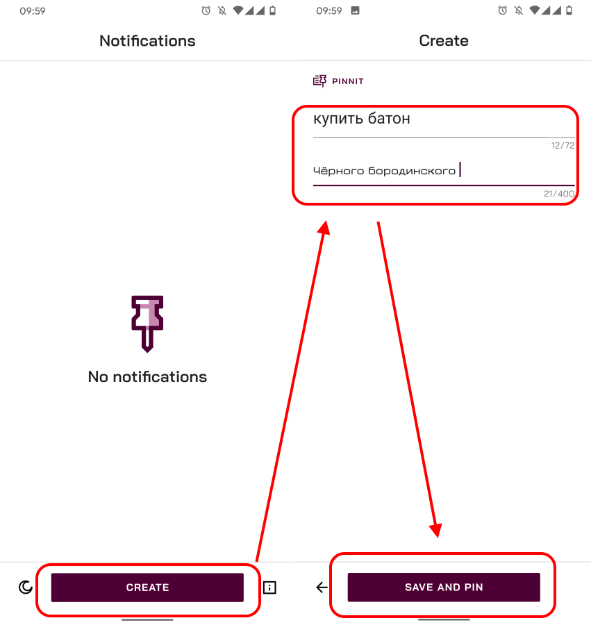 Чтобы добавить сообщение самому себе или задачу запустите приложение и нажмите кнопку Create. В следующем окне можно добавить короткое название и чуть более развёрнутое описание.