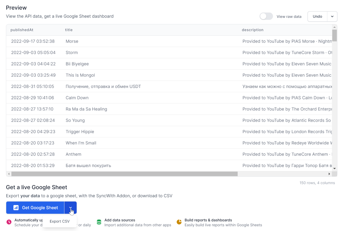 Затем можно нажать Get Google Sheet, что создаст файл в Google Таблицах, который можно будет автоматически обновлять в будущем. Либо выбрать Export CSV для сохранения информации в CSV.