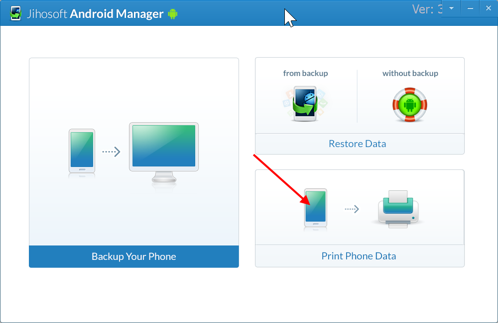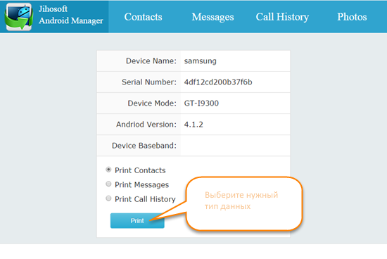После установки Jihosoft Android Manager нужно подключить смартфон к компьютеру по проводу и выбрать режим отладки по USB. А затем запустить само приложение и выбрать пункт Print Phone Data.