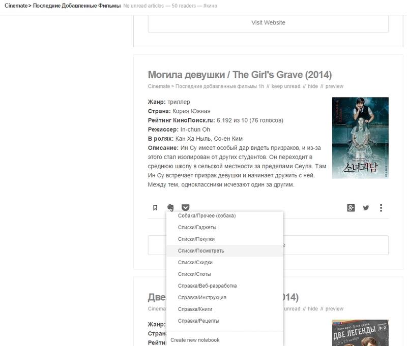 Я подписан на сайты с новинками фильмов. Так же я читаю множество технический сайтов. Если я читаю о каком-то интересном мне фильме, я могу в один клик создать заметку со статьей: