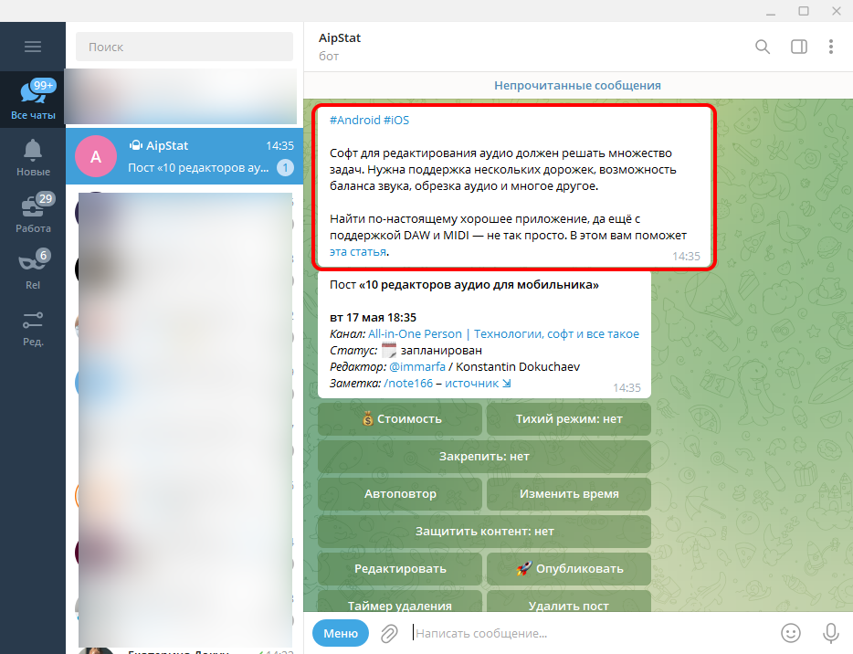 - Перехожу в бот и вижу в нём исправленный вариант, под ним — кнопка Обновить пост;