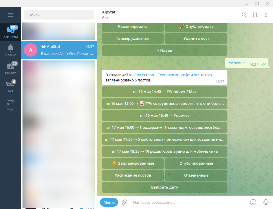 Со временем я нашёл в боте несколько других полезных (конкретно для меня) фишек. Например, отчёты клиенту о публикациях или закрепление постов на время.
