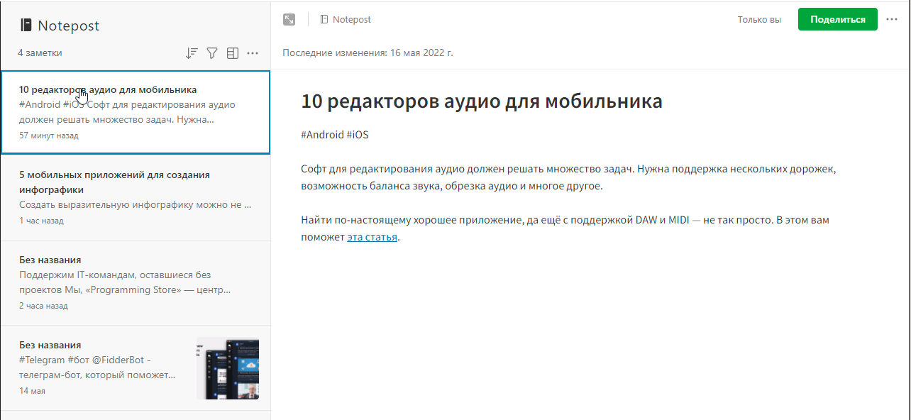 Сначала я переехал на Notepost просто из-за отсутствия более удобных альтернатив для автопостинга в Telegram. Постепенно с помощью интеграций я смог настроить свой воркфлоу даже в более удобном режиме, чем раньше.