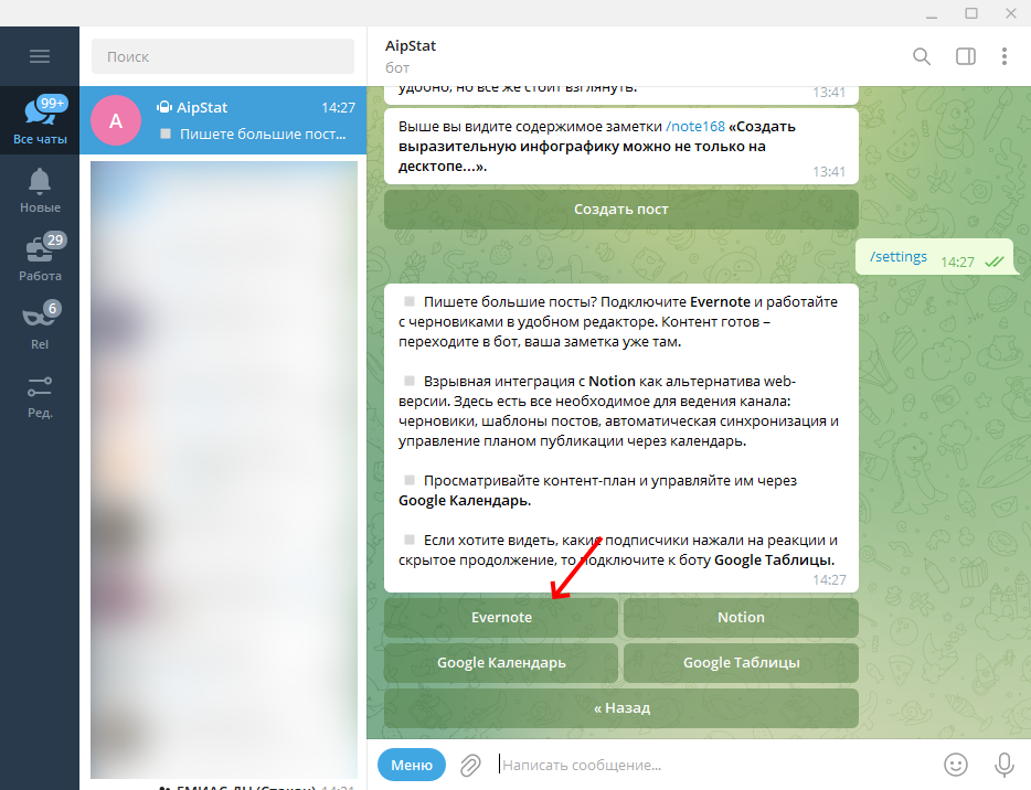Подключить Notepost к Evernote не сложнее, чем любой другой сервис. Для этого в меню настроек бота нужно перейти в раздел Интеграциии выбрать Evernote.