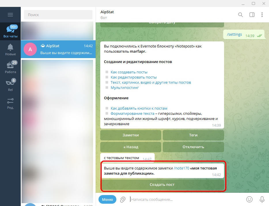 При создании заметки пост сразу появляется в боте. А все изменения синхронизируются в реальном времени.