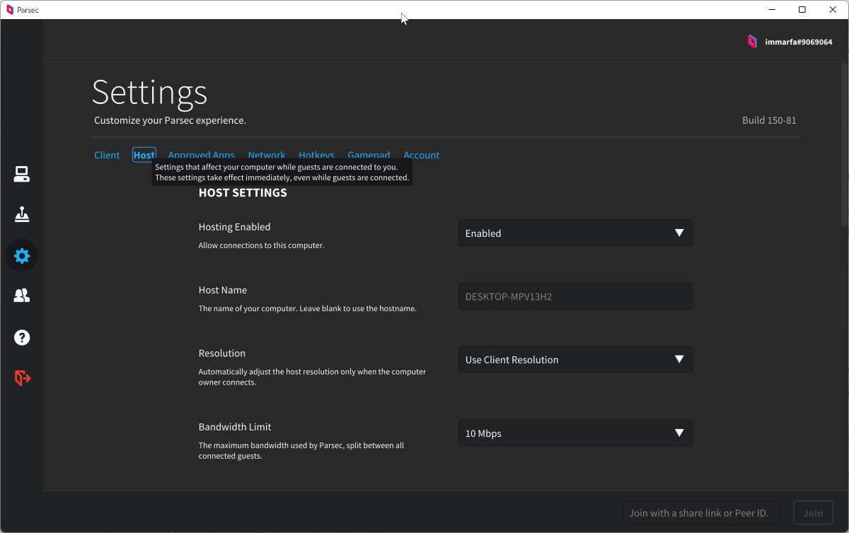 В старшей версии Parsec перейдите в раздел Settings > Host для базовой конфигурации приложения. Здесь вы можете указать ограничения по пропускной способности и разрешению игры.