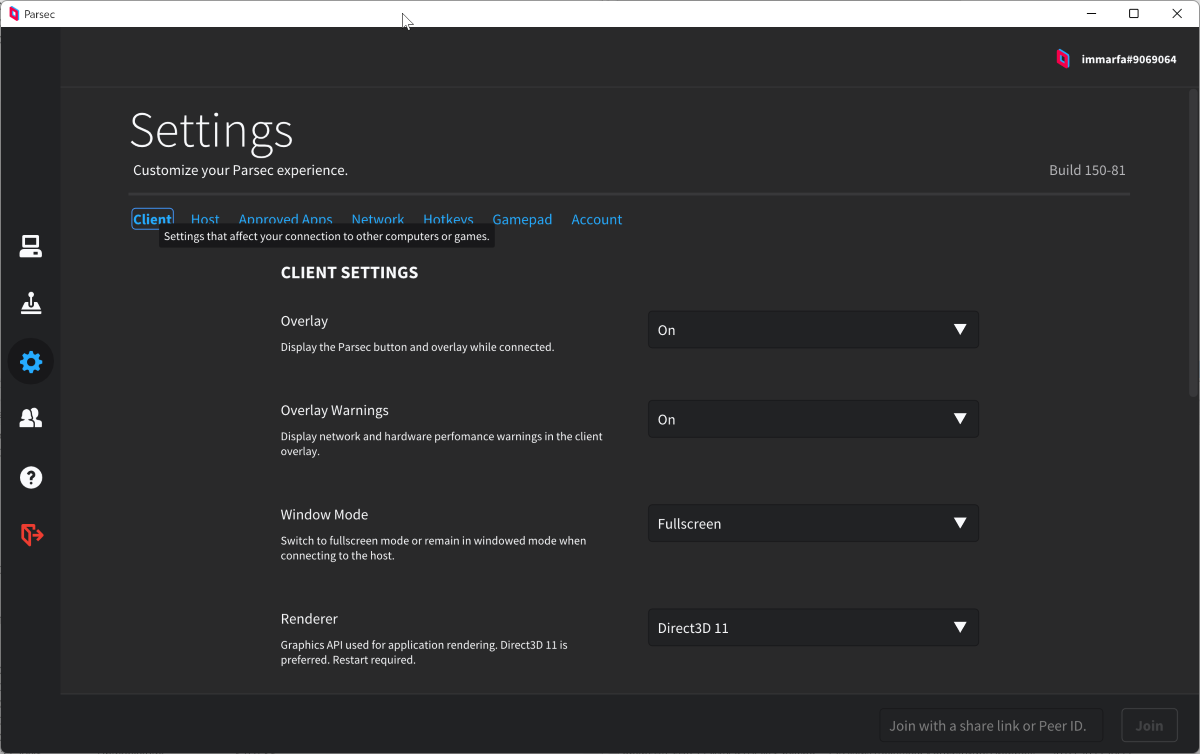 В разделе Client можно активировать отображение кнопок и оверлея Parsec. Так вы сможете быстро управлять серверным клиентом приложения.