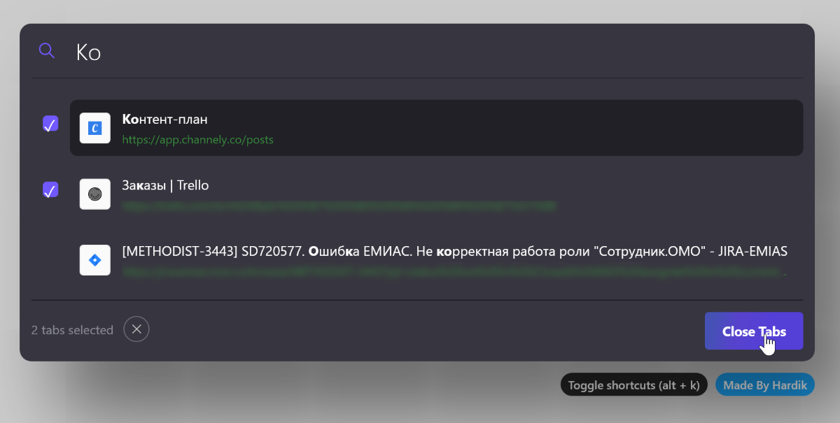 Для поиска достаточно ввести часть названия нужной вкладки. Найденные вкладки можно отметить чекбоксом и закрыть прямо из расширения.