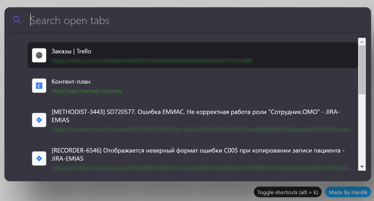 Hare — расширение для поиска по названиям открытых вкладок браузера.