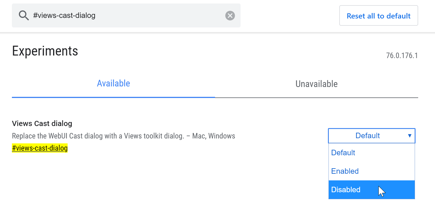 Повторите те же действия для флага #views-cast-dialog, но укажите значение Disabled: