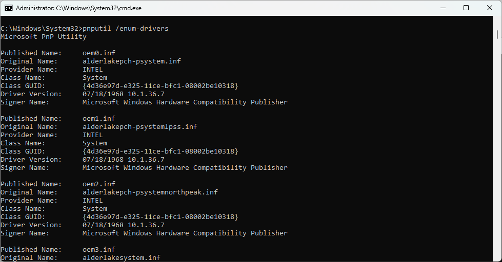Всё очень просто. Запустите командную строку от имени администратора и выполните команду pnputil /enum-drivers для получения списка всех драйверов в системе.