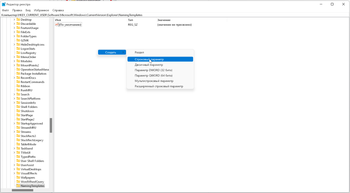 Нажмите правой кнопкой и создайте новый раздел. Затем переименуйте его в NamingTemplates.