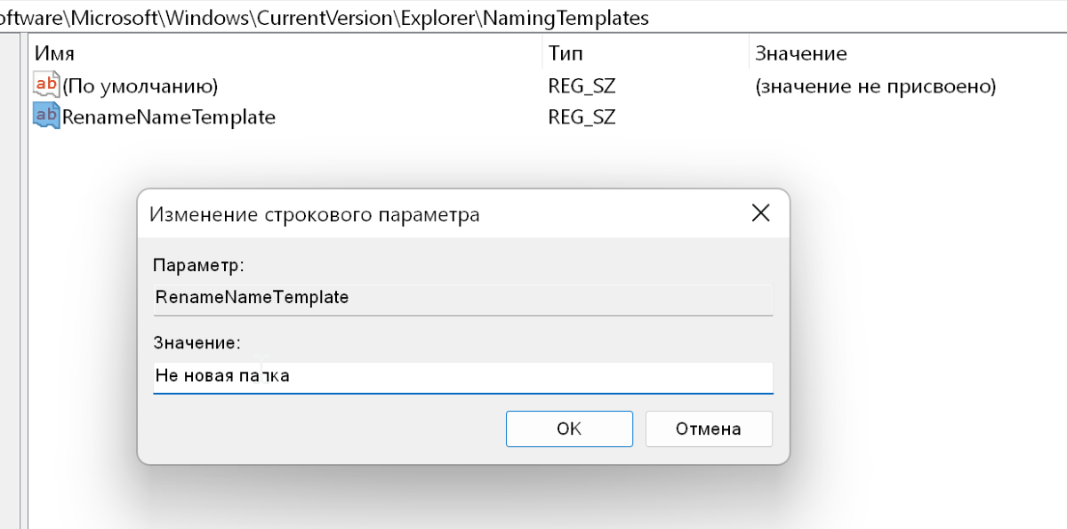 Теперь дважды кликните по нему и в поле Значение укажите новое название для новой папки.