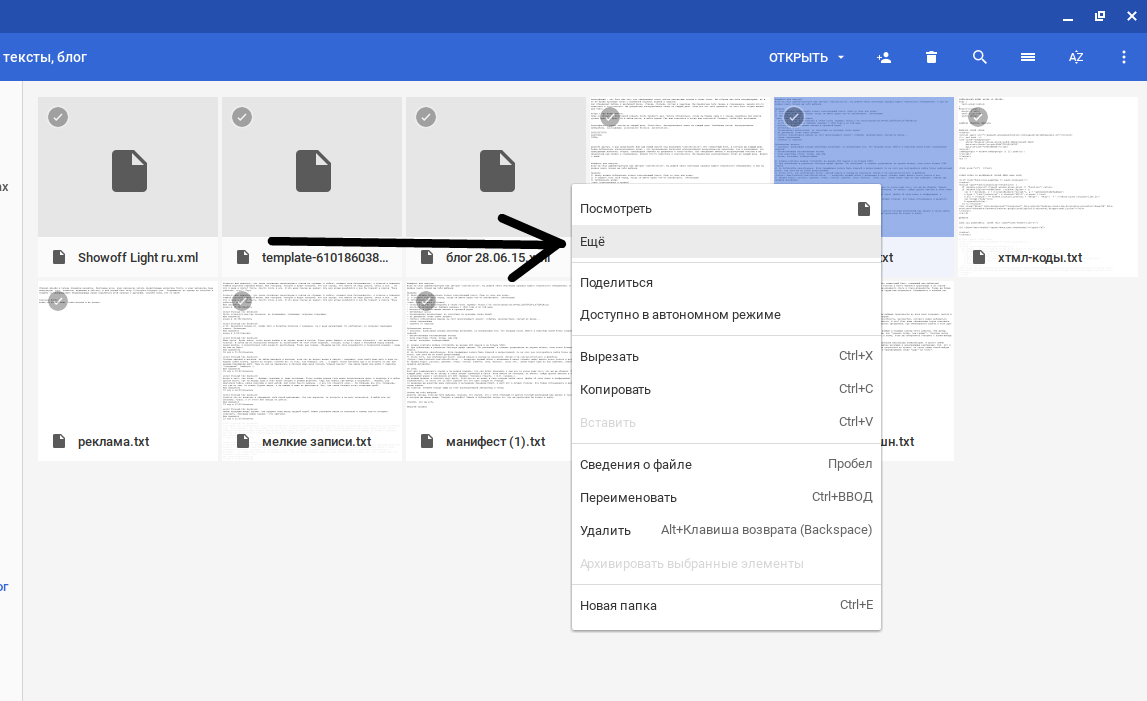 Для этого просто кликаем по нужному файлу и нажимаем на правую кнопку мыши (или тапаем двумя пальцами по тачпаду). Откроется меню, в котором видим кнопку «ещё». Нажимаем.
