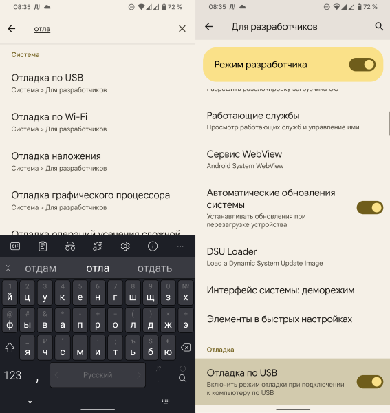 Активируйте режим отладки по USB на смартфоне. Для этого перейдите в Настройки и в поиске наберите слово «Отладка». Так вы сможете попасть в раздел Для разработчика и активировать переключатель Отладка по USB.