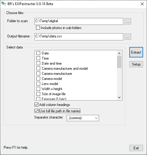 Пользоваться приложением очень просто. Нужно указать путь к папке с изображениями (можно активировать сканирование подпапок), указать файл для сохранения и выбрать EXIF-данные.