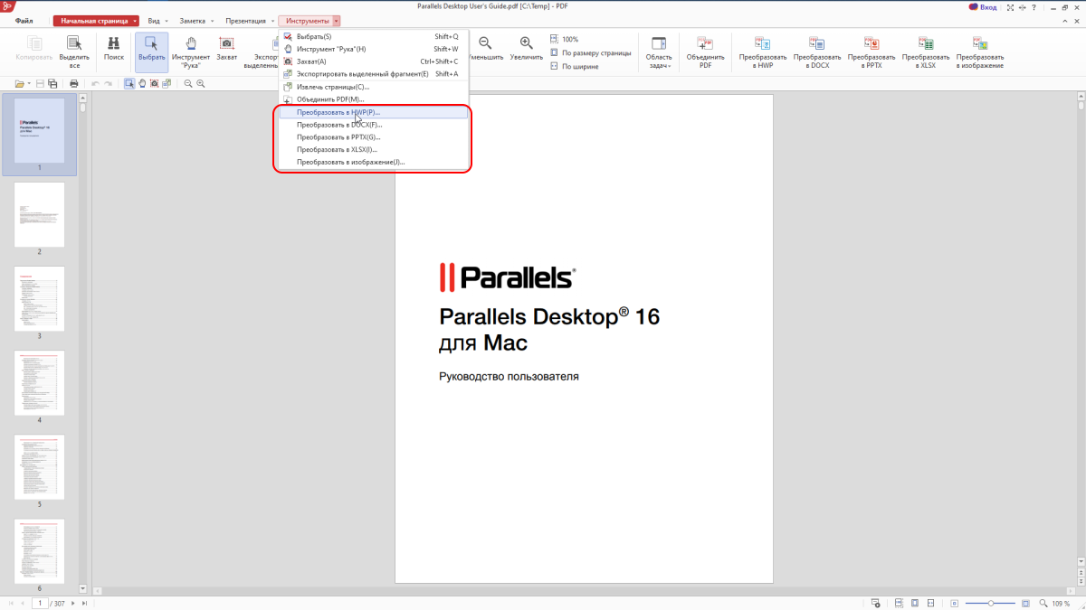Откройте исходный файл в PDF 2020, и в меню Инструменты вы увидите несколько пунктов для конвертации файла: