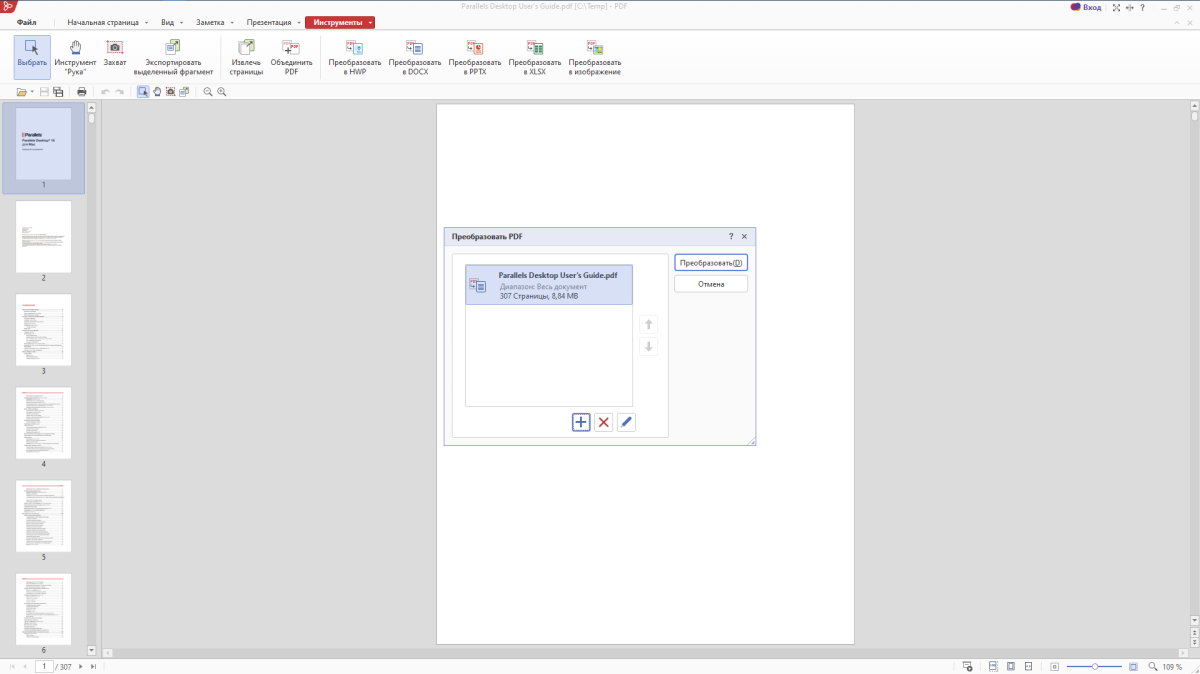 Для проверки я взял PDF-файл на 8,8 Мб и 307 страниц. Сам процесс конвертации одинаковый для любого пункта. Я на всякий случай объясню, для чего нужен каждый формат.