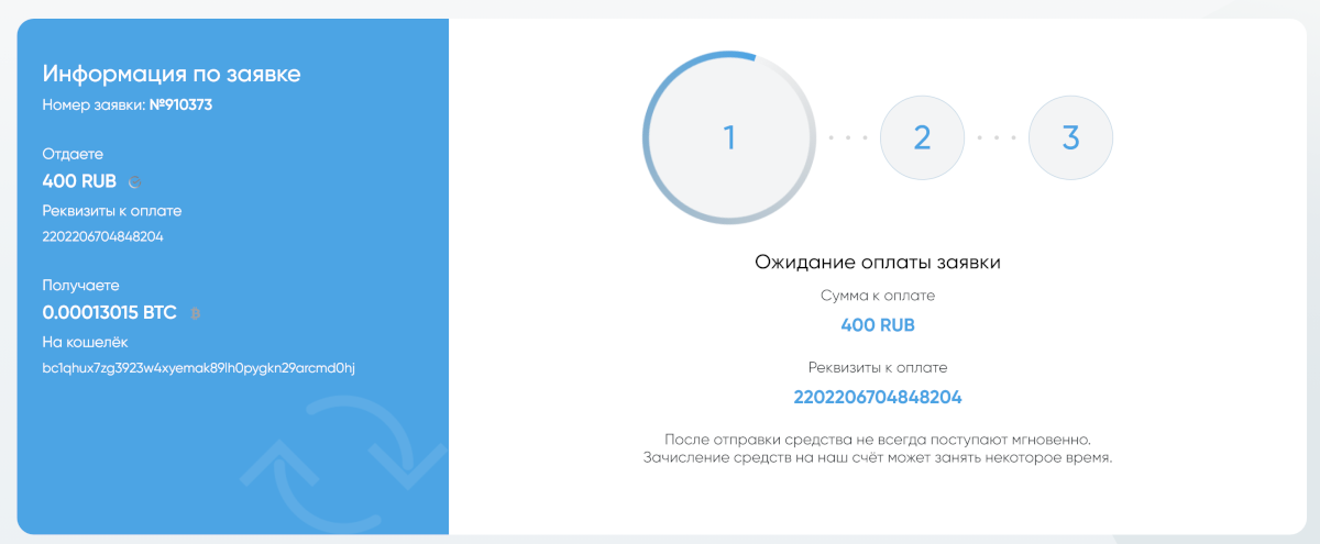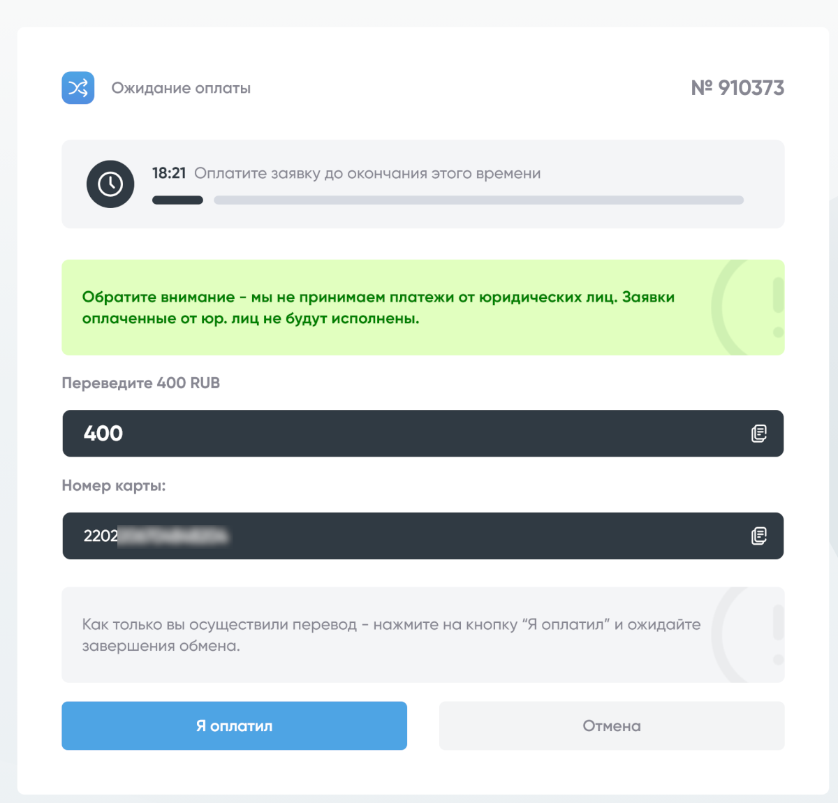 После перевода остаётся нажать Я оплатил и ожидать поступления денег на указанный кошелёк. Перевод может занимать до 15 минут — зависит от выбранных путей конвертации.