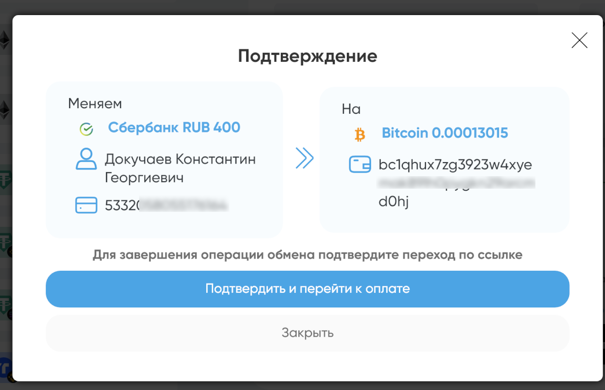 На следующем шаге вы ещё раз увидите все данные будущего обмена. Внимательно проверьте эту информацию, ведь от этого зависит успешность обмена. Если всё OK, нажимайте Подтвердить и перейти к оплате.