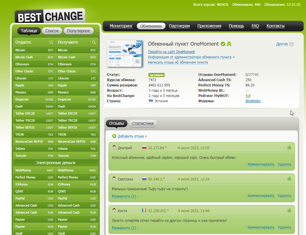 Обменник числится на популярных мониторингах, вроде BestChange, а значит, вы можете доверять ему. Ну или можно лишний раз убедиться в его работе, ознакомившись с отзывами других пользователей. Как видно, отзывы положительные, и OneMoment заслуживает доверия со стороны клиентов.