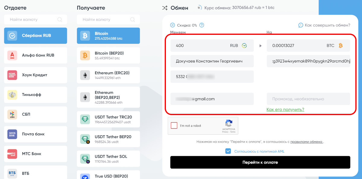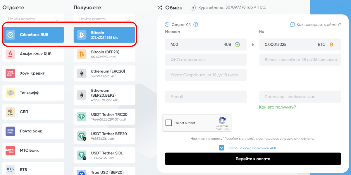 Также нужно указать сумму обмена. Курс рассчитывается автоматически, поэтому указать достаточно либо сумму, которую хотите отдать, либо получить. Когда всё заполнено, нажмите Перейти к оплате.