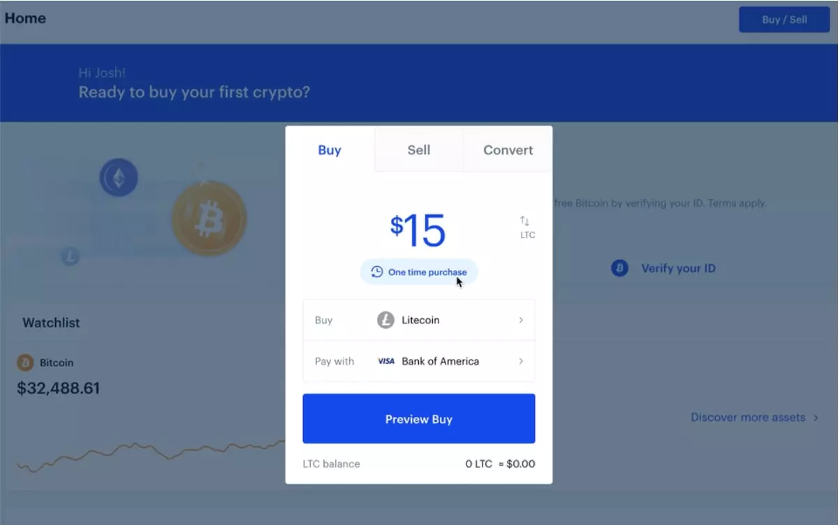 Как только внесённые средства отобразятся на вашем счёте, вы сможете разместить свой заказ. Большинство бирж предлагают упрощённый и расширенный интерфейсы. Если вы ещё недостаточно хорошо знакомы с тонкостями торговли, отдайте предпочтение первому варианту. Например, на Coinbase всё, что вам нужно сделать, — это ввести сумму, а платформа позаботится обо всём остальном.