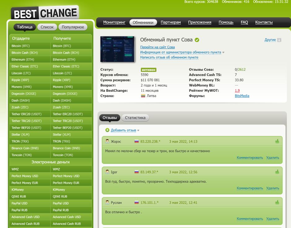 В этом посте я расскажу про обменник Sova, которым я сам пользовался для пополнения (теперь уже мёртвого) Bankoff, и буду пользоваться для пополнения ещё живого Moon и Pyypl. И этот обменник есть на BestChange, что по моей шкале доверия даёт этому обменнику 10 звёздочек из 10.