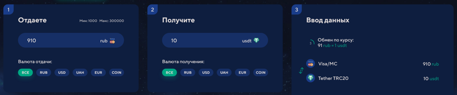 К примеру, я хочу купить с рублёвой Mastercard 10 штук USDT. Для этого я выбираю обмен в соответствующем направлении и указываю сумму, которую хочу получить в итоге. Обменник автоматически рассчитывает курс обмена и сообщает сумму, которую нужно оплатить.