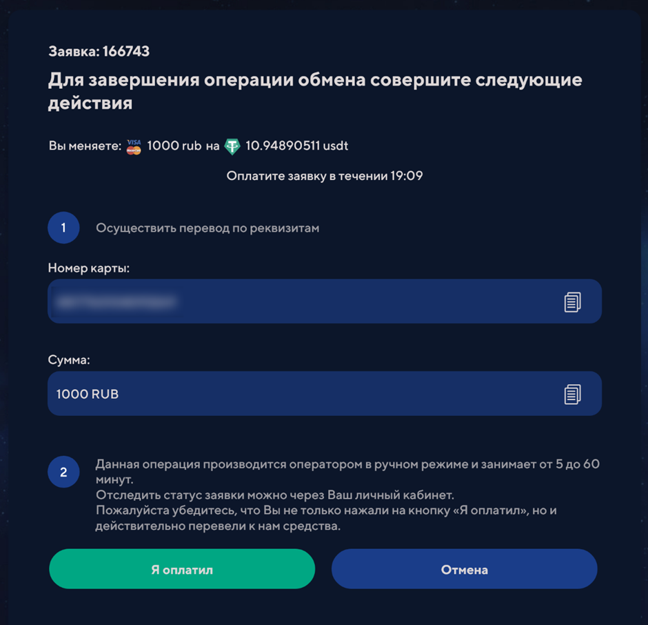 Оплату нужно произвести за отведённый промежуток времени, после чего нажать кнопку Я оплатил. После этого в течение 5-10 минут (иногда до часа) деньги поступят на указанный номер кошелька. А за статусом заявки можно следить на отдельной странице.
