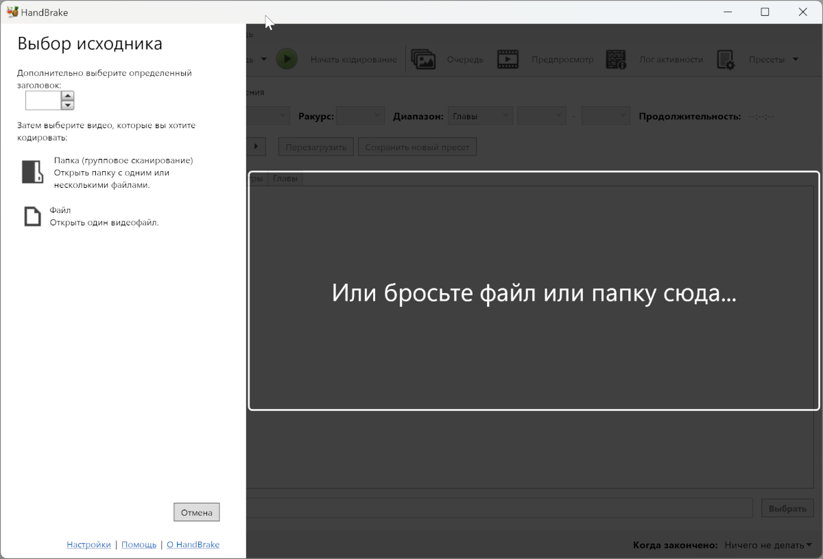 В самой установке HandBrake нет ничего особенного, поэтому перейдём непосредственно к нашей задаче. После запуска утилита предложит добавить нужный видеофайл. Это можно сделать простым перетаскиванием.