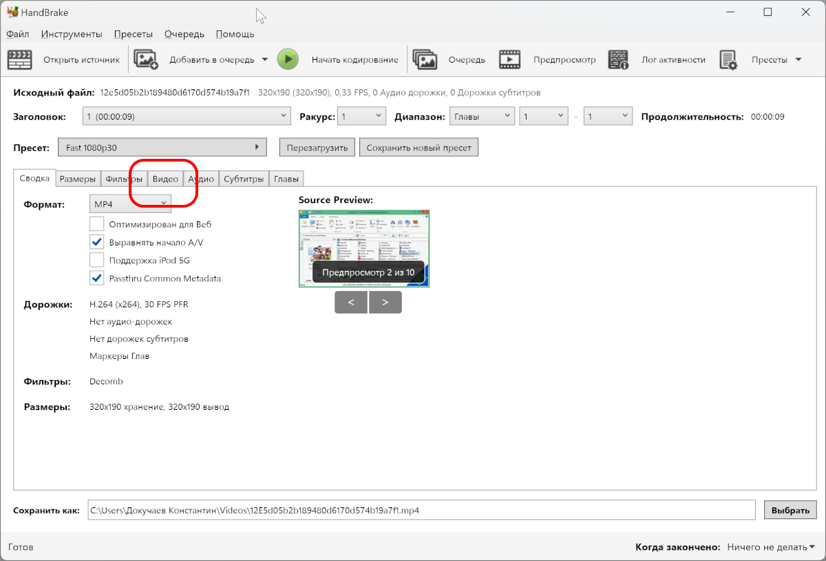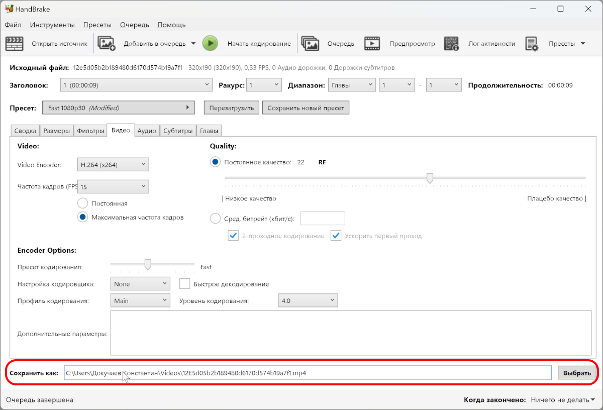 Далее в нижней части окна нужно выбрать путь, по которому будет сохранено видео после кодирования.