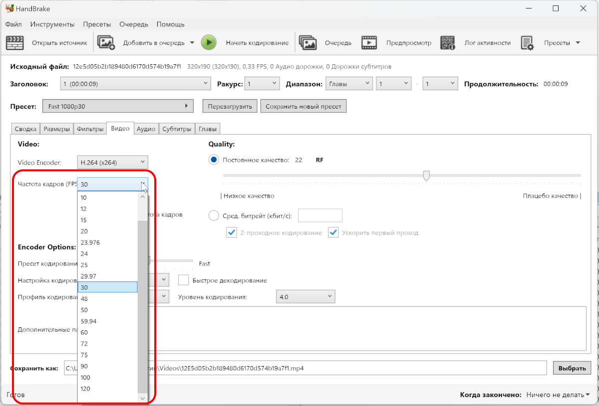 В ней в выпадающем меню Частота кадров (FPS) нужно указать необходимую частоту кадров. Её можно как повысить, так и понизить.