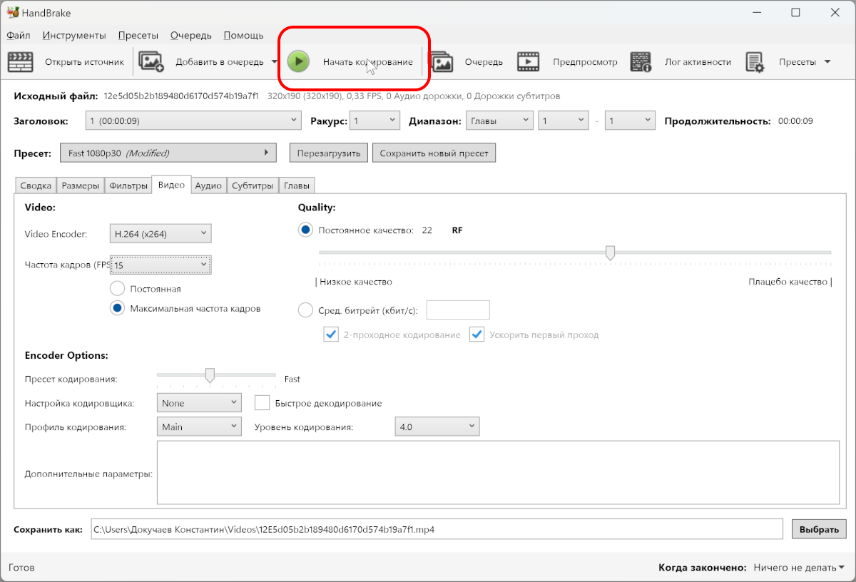 Теперь остаётся только нажать на кнопку Начать кодирование, и HandBrake запустит обработку нашего видео.