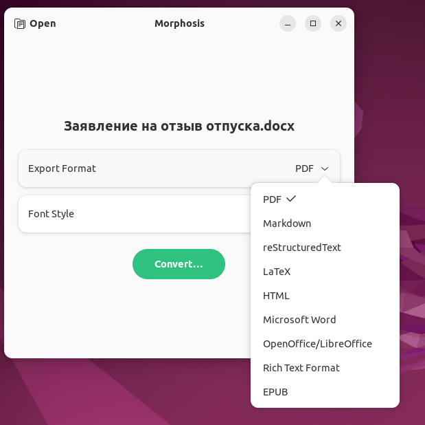 В случае с Linux можно установить бесплатное приложение Morphosis, которое позволяет просто загрузить документ, выбрать формат конвертации и получить результат.