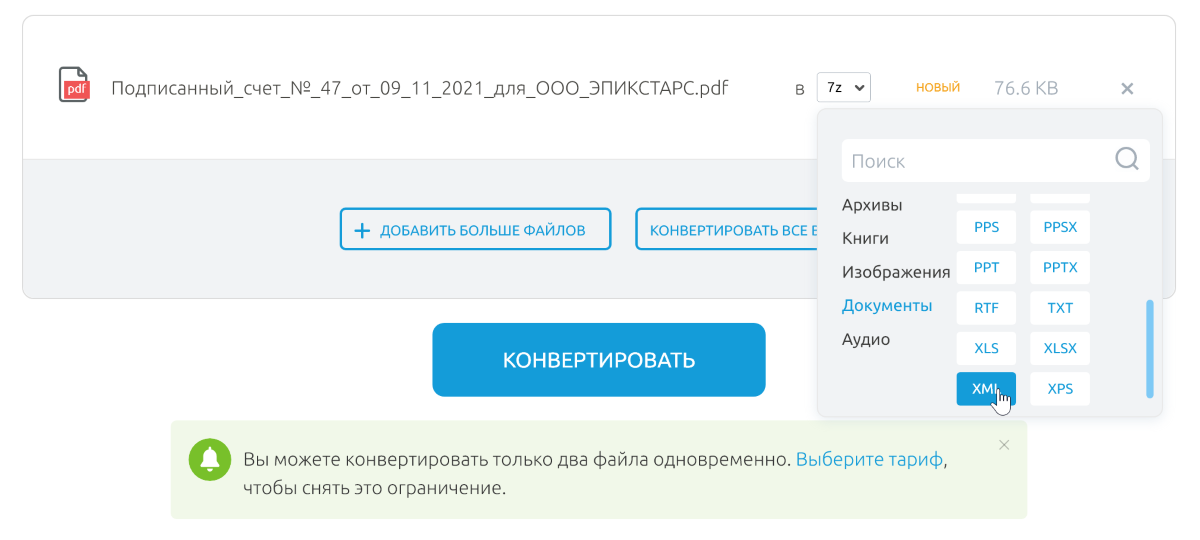 Затем выбираем XML-формат в разделе документы. Либо можно выбрать один из десятков других форматов в категориях документы, книги, изображения, архивы или аудио.