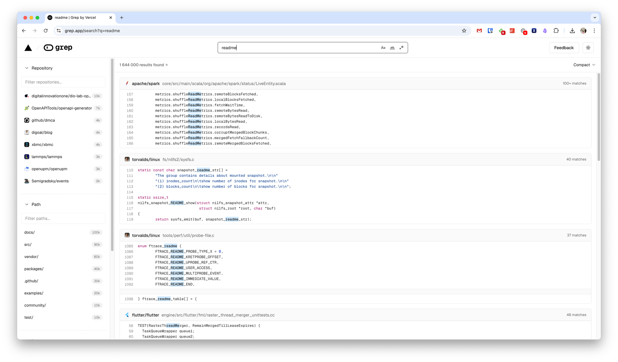 В таком случае можно воспользоваться поисковиком grep, который помогает искать во всех репозиториях по коду, файлам или путям.