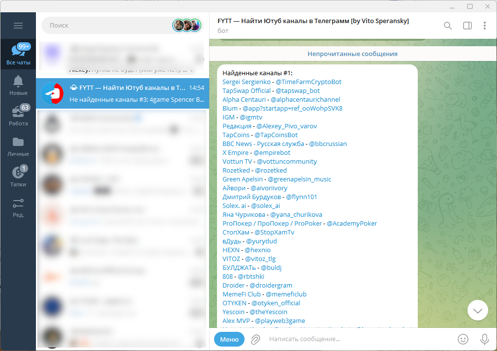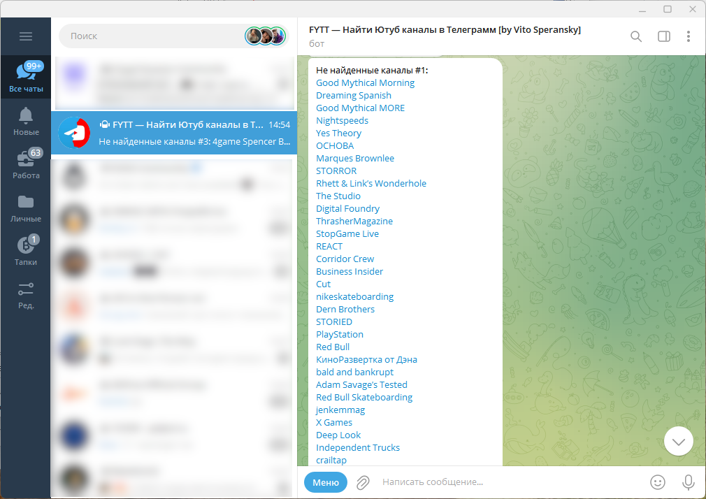 В зависимости от количества подписок, придётся подождать некоторое время. Зато в итоге вы получите два списка: Telegram найден и не найден. А дальше дело уже за вами — подпишитесь на нужные аккаунты и забудьте про этот YouTube.