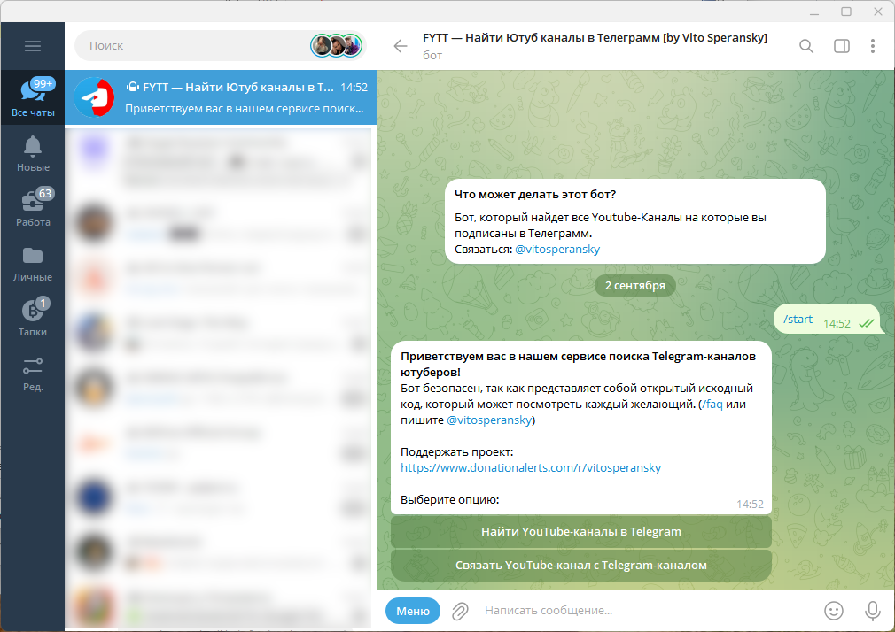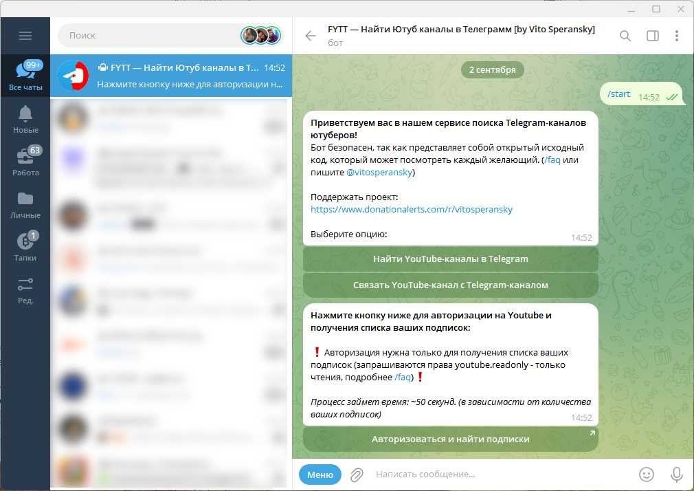 После его запуска у вас есть два стула: найти каналы и создать привязку самостоятельно, второй вариант нужен, если вы точно знаете ссылку на Telegram-автора, а бот её не нашёл.