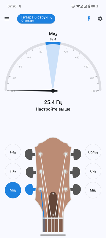 Хотя в приложении и есть несколько полезных настроек, в целом от вас требуется просто запустить его, выбрать нужную струну и дёрнуть её. После чего Guitar Tuner подскажет — нужно настроить её выше или ниже.